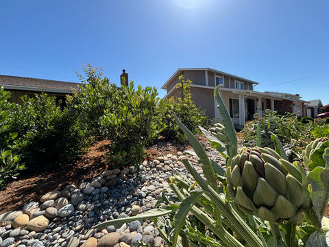 This project was done is late 2023 and features a dry creek bed with water-retaining swale, loads of perennial edibles - fruit trees, berries, vines, greens and tubers!